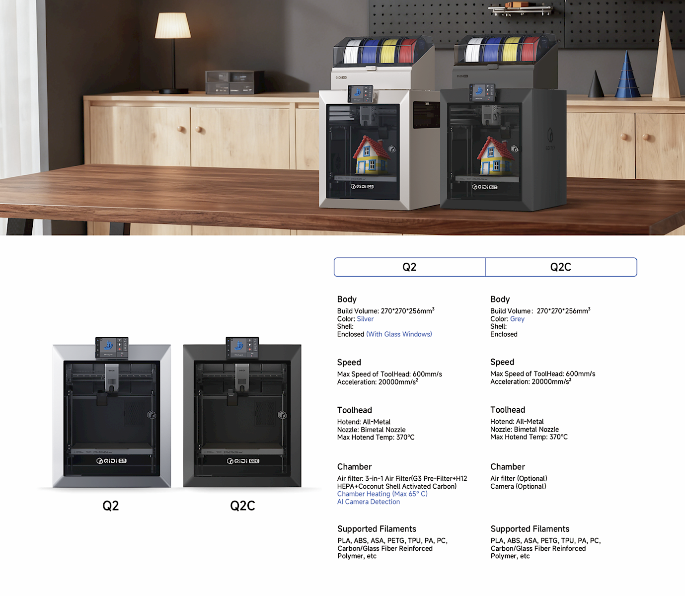 QIDI Tech Q2C Combo 3D Yazıcı, gelişmiş CoreXY hareket sistemi ile yüksek hız ve hassasiyet sunan profesyonel sınıf bir FDM yazıcıdır. 370°C’ye varan hotend sıcaklığı ve çift hazne ısıtma desteği sayesinde mühendislik filamentlerinde de kararlı baskı yapma imkânı sağlar. Kapalı kasa tasarımı, entegre hava filtre sistemi ve stabil sıcaklık kontrolü ile hem günlük projelerde hem de teknik parçalar için ideal performans sunar.