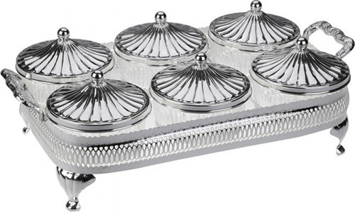 Queen Anne Gümüş Cam 6 lı Sunum Tepsili Kapaklı Kase Set 38*21