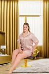 Quilling Sütlü Kahverengi Çizgili Desen Şık Ve Kısa Kol, Lady 16053 Büyük Beden Şortlu Saten Pijama Takımı