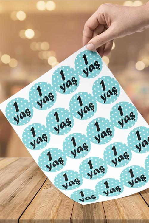40 Adet 5 cm Çapında 1 Yaş Mavi Renk Beyaz Yuvarlak Temalı Sticker Etiket Çıkartma.