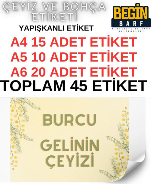 Paket içerisinde A4 boy etiketten 15 adet A5 boy etiketten 10 adet A6 boy etiketten 20 adet Olmak üzere toplam 45 adet etiket gelecektir.