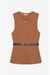İçi astarlı, bel kısmında metal tokalı kemer detayı bulunan, gold düğme aksesuarlı, şık ve modern tasarımlı kolsuz yelek.