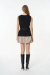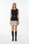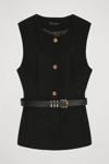 İçi astarlı, bel kısmında metal tokalı kemer detayı bulunan, gold düğme aksesuarlı, şık ve modern tasarımlı kolsuz yelek.