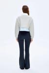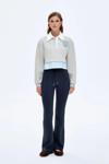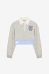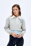 Ön kısmı yazı nakışlı, polo yaka, uzun kollu, içi şardonlu, ribanalı manşetli, etek ucu gömlek garni detaylı sweatshirt.