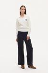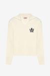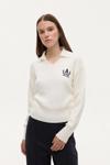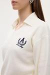 V yaka, gömlek yaka detaylı, göğüs kısmı arma nakış işlemeli, uzun kollu, ribana manşetli, şık görünüm sunan triko kazak.
