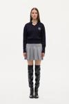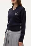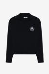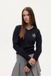 V yaka, gömlek yaka detaylı, göğüs kısmı arma nakış işlemeli, uzun kollu, ribana manşetli, şık görünüm sunan triko kazak.