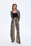 Yılan deseni baskılı, yüksek bel, bol paça, yan cepli, fermuarlı ve kanca kapamalı, gold kemer aksusarlı, uzun bol paça pantolon.