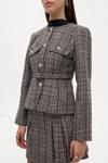 İçi kendi renginden astarlı, yuvarlak yaka, cep düğme kapaklı, düğme detaylı, kemer aksesuarlı, yandan cepli, uzun kollu, tüvit ceket.