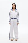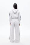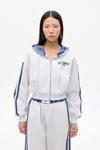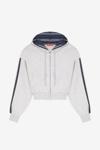 Kapüşonlu içi çizgili kumaştan, kolları şerit detaylı, fermuar kapamalı, göğsü yazı nakış baskılı, şardonsuz, ip büzgü detaylı, kanguru cepli, uzun kollu, kısa boy sweatshirt.