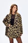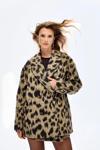 İçi kendi renginden astarlı, kruvaze yaka detaylı, çift sıra düğmeli, yan cepli, uzun kollu, leopar desenli kaban.
