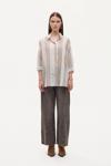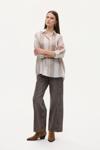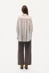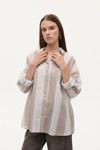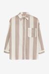 Gömlek yakalı, uzun kollu, önden düğmeli, göğüs kısmında cep detaylı, çizgili ekose desenli ince kumaş, oversize uzun gömlek.