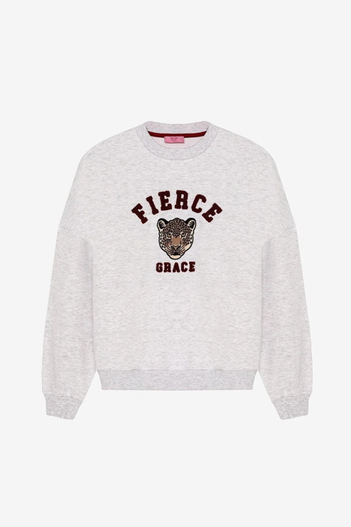 Yuvarlak yaka, uzun kollu, içi şardonsuz, ön kısmı leopar desenli ve yazı nakış detaylı, oversize sweatshirt.