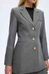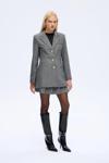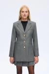İçi astarlı, uzun kollu, vatkalı omuz detaylı, kruvaze yaka, gold düğmeli, bele oturan formda, sırtı kemer detaylı, blazer ceket.