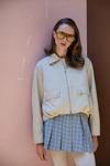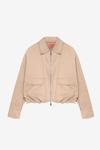 Uzun kollu, içi yazı baskılı astarlı, önü fermuarlı, büyük kapaklı cep detaylı, büzgü formunda, sırtı şeritli ribana detaylı, gömlek yaka, oversize bomber ceket.
