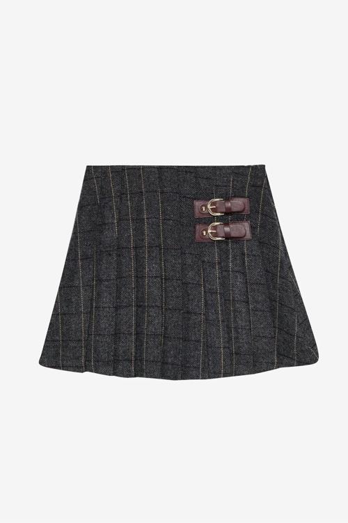 İçi şort astarlı, yan kısmı çift kemer toka aksesuarlı, pileli formda, yandan fermuarlı, mini boy balıksırtı desenli etek.