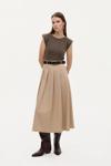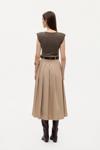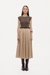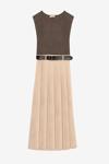 Yuvarlak yaka, omuzu vatkalı, kolsuz, kemer aksesuarlı, yandan fermuar kapamalı, pileli kontrast kumaş detaylı midi elbise.