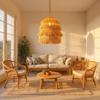 Rafya Spiral Bağlama Avize, zarif spiral tasarımı ve doğal malzeme kullanımı ile mekanlarınıza estetik bir dokunuş katarken, sıcak ve davetkar bir atmosfer yaratır. Hem şık hem de çevre dostu bir seçenek sunar.