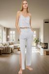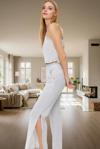 Yumuşak ve rahat bir uyku için tasarlanan gri melenj pijama takımımızla tanışın! %48 pamuk ve %52 polyester karışımı kumaş, nefes alabilirlik ve konfor sunar. V yaka ince askılı üst ve uzun paçalı altıyla, hem şık hem de rahat bir deneyim yaşayacaksınız. Regular kalıbı, her vücut tipine uyum sağlayacak şekilde tasarlanmıştır. Normal bel yüksekliği ile rahat hareket imkanı sunar. Yırtmaç detaylı paçalar, gün boyu rahat bir hareket kabiliyeti sağlar. Makinede 60 derecede yıkanabilir olması pratik kullanım sağlar.