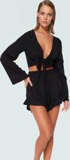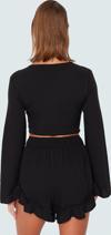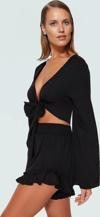 Crinkle dokuma kumaşın hafifliği ve nefes alabilirliğiyle yaz sıcağında rahatlığı deneyimleyin. V yaka ve bağcıklı detaylar, bluza şık bir hava katıyor. Fırfırlı şort, hareketli ve feminen bir görünüm sunuyor. Kısa boy ve regular kalıp, konforlu bir kullanım sağlıyor. %60 viskoz ve %40 polyester karışımı, takımın dayanıklılığını ve kalitesini garanti ediyor.
