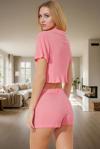 Evinizin rahatlığında şıklıktan ödün vermeyin! Bu pembe pijama takımı, yumuşak dokusu ve modern tasarımıyla evde geçireceğiniz zamanları daha keyifli hale getirecek. Polyester ve elastan karışımından üretilen kumaş, nefes alabilir özelliği sayesinde gün boyu konfor sunar. V yaka ve kısa kollu tasarımıyla yaz aylarına uygun olan bu takım, regular kalıbıyla her vücut tipine mükemmel uyum sağlar. Crop şort ve üst kombinasyonu sayesinde gün boyu rahat hareket edebilirsiniz.