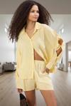 Evde vakit geçirmenin en keyifli yolu, şık ve rahat bir pijama takımıyla mümkün! Bu pembe viskon pijama takımı, yumuşak dokusuyla gün boyu süren konfor sunuyor. Bağlamalı kol detayı, takıma şık bir görünüm katarak, evde bile kendinizi özel hissetmenizi sağlar. Uzun kollu gömlek ve şorttan oluşan takım, her mevsim rahatlıkla kullanılabilir. Regular kalıp, vücuda tam oturur ve hareket özgürlüğü sağlar.