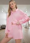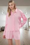 Evde vakit geçirmenin en keyifli yolu, şık ve rahat bir pijama takımıyla mümkün! Bu pembe viskon pijama takımı, yumuşak dokusuyla gün boyu süren konfor sunuyor. Bağlamalı kol detayı, takıma şık bir görünüm katarak, evde bile kendinizi özel hissetmenizi sağlar. Uzun kollu gömlek ve şorttan oluşan takım, her mevsim rahatlıkla kullanılabilir. Regular kalıp, vücuda tam oturur ve hareket özgürlüğü sağlar.