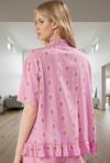 Yumuşak viskon kumaşı ve rahat kesimiyle evde huzurlu zamanlar geçirmenizi sağlayacak bu pembe pijama takımını keşfedin! Etnik desenleriyle tarzınızı yansıtırken, kısa kollu gömleği ve fırfırlı şortu ile yaz aylarının sıcak gecelerinde serin kalmanızı sağlar. %100 viskon olan bu nefes alan kumaş, gün boyu konfor sunar. Regular kalıp, vücudunuza mükemmel bir şekilde uyum sağlar. Makinede yıkanabilir olması ise pratik kullanım sunar.