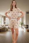 Yumuşak ve nefes alan örme kumaştan üretilen bu bej renk pijama takımı, yaz aylarında konforlu bir uyku deneyimi sunmak üzere tasarlandı. Kalpli desenleriyle göz alıcı bir görünüme sahip olan takım, hem şık hem de rahat bir seçenek. Kısa kollu tişörtün bisiklet yakası ve regular kalıbı, vücudunuza mükemmel şekilde oturur. Şortun lastikli beli ve rahat kalıbı sayesinde hareket özgürlüğünüzü kısıtlamadan gün boyu rahat edebilirsiniz. 'Adore' yazılı fitilli paçalarıyla şıklığınıza şıklık katan bu takım, %95 polyester ve %5 elastan içeren yapısıyla da dayanıklılığını kanıtlar. Makinede 60 derecede kolayca yıkanabilir ve uzun süreli kullanım sağlar. Normal bel ve basic silüetle tasarlanan takım, her vücut tipine uyum sağlar. Hem evde dinlenirken hem de lounge ortamlarında rahatlıkla kullanılabilen bu iki parçalı takım, yaz sezonunun ideal tercihlerinden.