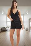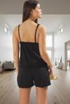 Yaz aylarında evde rahatlık arayanlar için ideal olan bu 2'li siyah pijama takımı, yüksek kaliteli viskoz süprem kumaştan üretilmiştir. Nefes alan yapısı ve yumuşak dokusu ile gün boyu konfor sunar. İnce askılı, V yakalı üstü ve boru paçalı şortu ile şık ve rahat bir kombin oluşturur. Dantel detaylarıyla feminen bir dokunuş katan tasarım, her vücut tipine uyum sağlayan regular kalıptır.