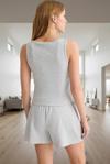 Yumuşak dokusuyla gün boyu süren konfor sağlayan bu gri pijama takımı, evde huzurlu ve keyifli anlar geçirmenizi sağlar. V yaka detayı ve kalın askılı atlet üstü ile şık ve rahat bir tarz sunarken, waffle dokusu ve %58 polyester, %42 pamuk karışımı nefes alabilir ve yumuşak bir his sunar. Boru paça şortu ile her vücut tipine uygun, Regular kalıbıyla tasarlanmıştır.