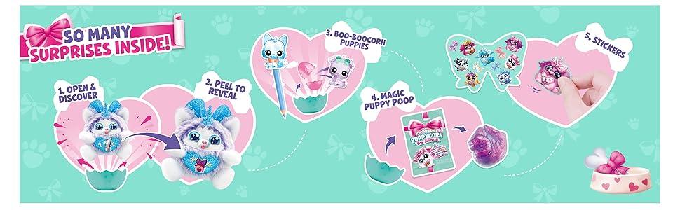 Bu Puppycorn’ların her biri moda tutkusuna sahip ve çocukların yeni tüylü arkadaşları olmak için sabırsızlanıyorlar. En çok neyi sevdiğini öğrenmek için kalbinin üzerindeki kabuğu soymak ve mini Boo-Boocorn’u yumurtasından çıkarmak çok heyecanlı!