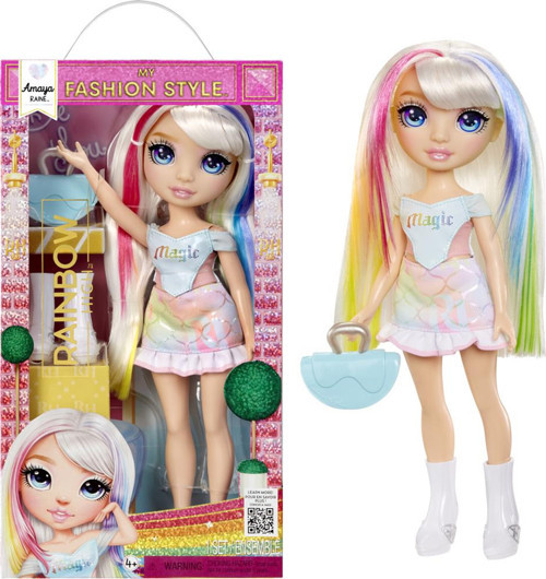 Rainbow High Amaya Raine, beyaz zemin üzerine gökkuşağı renkli saçları ve ışıltılı kombinleriyle serinin en özel modellerinden biri!