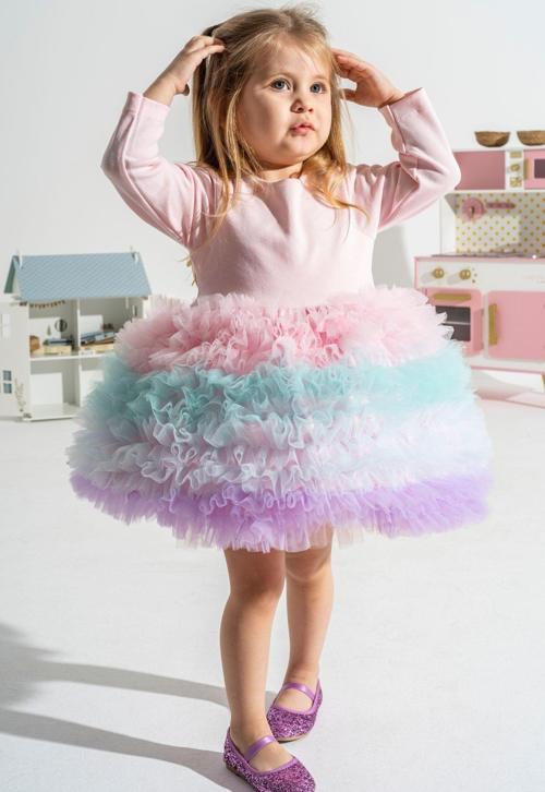 Bisiklet yakalı uzun kollu üst bedeni penye alt eteği renk geçişli tütü detaylı hem günlük hem özel günde tercih edebilirsiniz.Ürünlerimiz tam kalıptır.Kuru temizleme önerilir.Ayakkabı fiyata dahil değildir.