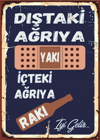 Bu tablo sadece duvara değil, kafaya da işler! “Dıştaki ağrıya YAKI, içteki ağrıya RAKI iyi gelir” mesajıyla gelen retro ahşap tablo, hem güldürür hem düşündürür. Esprili dili, vintage tasarımı ve kültürel göndermesiyle tam bir “duvar klasiği” adayı.