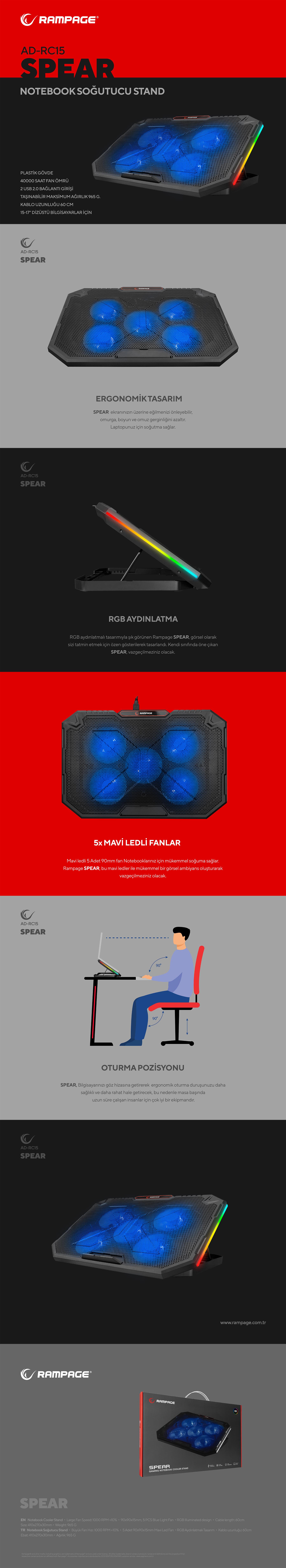 Rampage AD-RC15 SPEAR Siyah 5 Fan 2 USB RGB Işıklı 15-17 Notebook Soğutucu Stand
