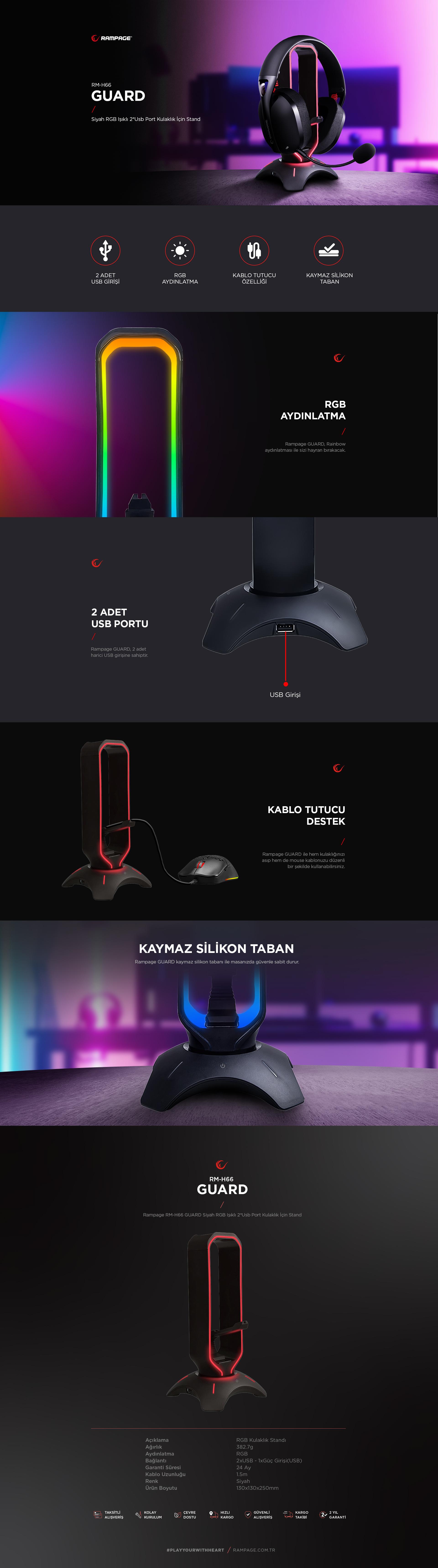 Rampage RM-H66 GUARD Siyah RGB Işıklı 2*Usb Port Kulaklık İçin Stand