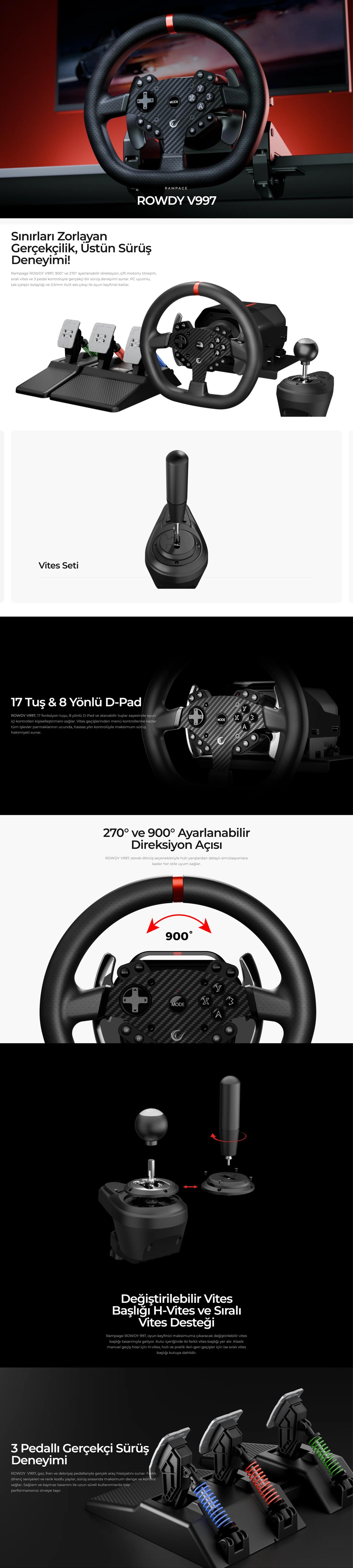 Sınırları Zorlayan Gerçekçilik, Üstün Sürüş Deneyimi!Rampage ROWDY V997, 900° ve 270° ayarlanabilir direksiyon, çift motorlu titreşim, sıralı vites ve 3 pedal kontrolüyle gerçekçi bir sürüş deneyimi sunar. PC uyumlu, tak-çalıştır kolaylığı ve 3.5mm AUX ses çıkışı ile oyun keyfinizi katlar.