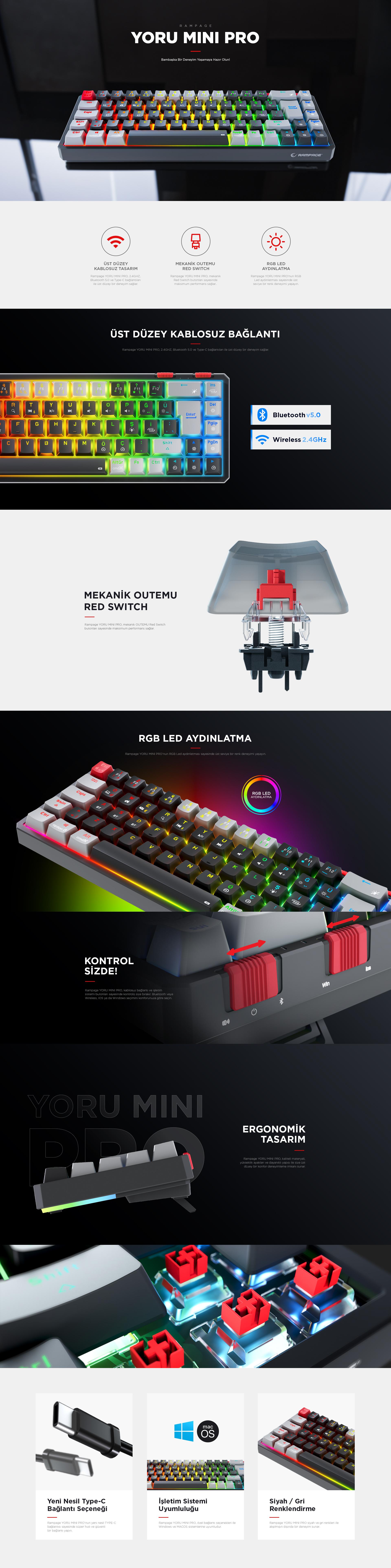 Rampage YORU Mini PRO Siyah/Gri 2.4ghz+BT5.0+Type-C 5 Bağlantı OUTEMU Red Swich Q Mekanik Gaming Oyuncu Klavye