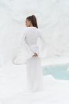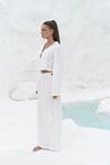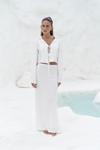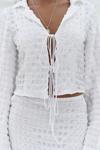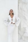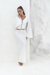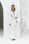 Katlı yaka, uzun kollu, dokulu crop. Kolları ispanyol kesim, önü ip bağlama detaylı. Elastik bel, düz kesim, dokulu midi boy etek. Yanlar cut-out pencere detay. Astarsız.