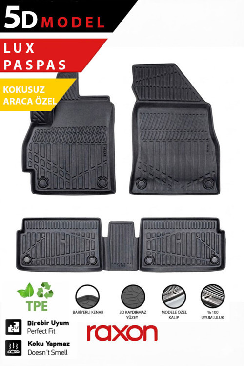 Raxon 5D Lux oto paspas, aracınızın iç mekanını kir, su, çamur ve aşınmaya karşı korumak için tasarlanmış premium araç içi zemin koruma ürünüdür. Yüksek kenarlı 5D tasarımı sayesinde araç zeminini tamamen kaplayarak sıvı ve kirlerin araç tabanına ulaşmasını engeller. Dayanıklı ve esnek malzeme yapısı uzun ömürlü kullanım sunarken aracın iç mekanına şık ve modern bir görünüm kazandırır. Kaymaz taban teknolojisi sayesinde sürüş sırasında paspasın sabit kalmasına yardımcı olur ve güvenli kullanım sağlar. Dört mevsim kullanıma uygun olan yapısı yağmur, kar, toz ve çamur gibi dış etkenlere karşı etkili koruma sunar. Kolay temizlenebilir yüzeyi sayesinde su ile kısa sürede temizlenebilir ve pratik kullanım sağlar. Araç içi zemin koruması için ideal olan Raxon 5D Lux paspas dayanıklı yapısı, yüksek kenarlı tasarımı ve premium görünümü ile aracınızın iç mekanını korumaya yardımcı olur. Paket içerisinde 1 takım araç içi paspas seti bulunmaktadır. Aracınız için en iyi uyumu seçin ve her yolculuğunuzda Raxon ürünleri ile konforu hissedin!