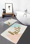 Altın yazılı geometrik pastel mavi ve pembe desenleriyle şık tasarım banyo paspas setimiz, banyonuza modern ve samimi bir dokunuş katar.