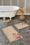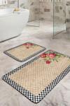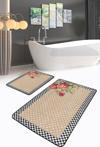 Bej zemin üzerine yerleştirilmiş pembe çiçek desenleri ve siyah beyaz kareli kenar tasarımıyla şık ve dikkat çekici bir görünüm sunan 2'li banyo paspas takımıdır.