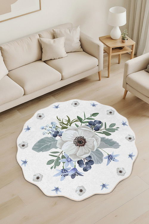 Beyaz çiçek desenine sahip bu özel kesim yuvarlak yıkanabilir kaymaz taban halısı, salonlarınız için mükemmel bir şıklık sunuyor.