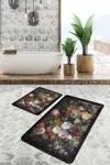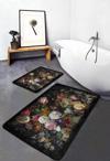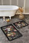 Çiçek buketi desenli, siyah ve koyu renk tonlarına sahip bu 2'li banyo paspas seti, banyolarınıza şıklık ve zarafet katmak için tasarlanmıştır.