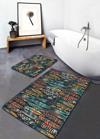 Canlı renklerin ve özgün çizgisel tasarımın harmanlandığı bu paspas seti, banyoda hem estetik hem işlevselliği arayanlar için ideal bir tercihtir.