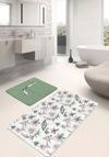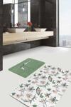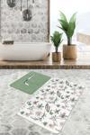 RealHomes Çizgisel Yaprak Ve Çiçek Desenli Yeşil Beyaz 2'Li Kaymaz Taban Yıkanabilir Banyo Paspas Seti