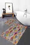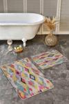 Çok renkli modern geometrik desenli 2'li banyo paspas seti, banyonuza hareketli ve şık bir dokunuş katmak için tasarlandı.