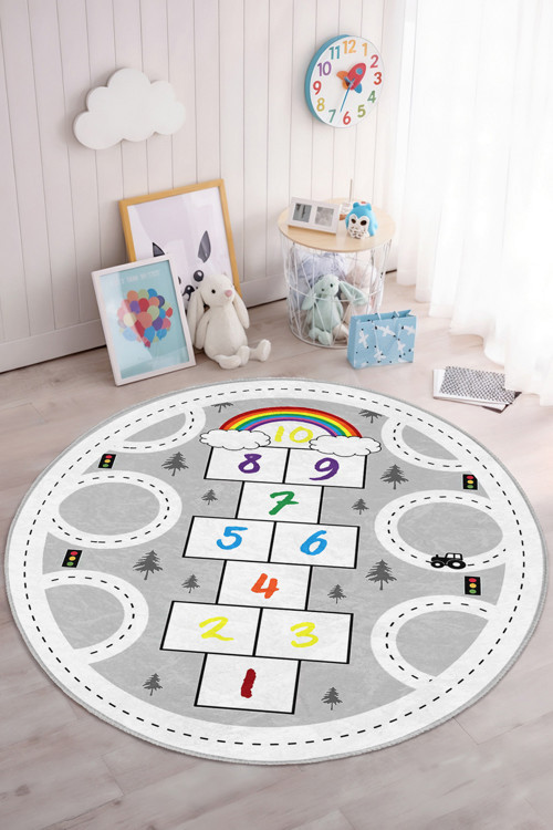 Eğlenceli Oyun Yolu Desenli Yuvarlak Çocuk Odası Yıkanabilir Kaymaz Taban Halı, çocukların hayal gücünü geliştiren, oyun oynamalarına olanak sağlayan bir üründür.