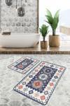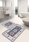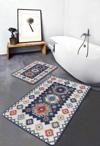 Etnik desenli lacivert ve turuncu renklerin uyumuyla tasarlanmış bu 2'li banyo paspas seti, banyonuza sıcak ve özgün bir hava katmak için idealdir.
