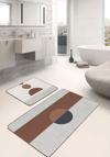 Geometrik desen ve çizgili tasarıma sahip kahverengi ve beyaz renklerle zenginleştirilmiş 2'li banyo paspas seti, banyonuza modern ve şık bir dokunuş katar.